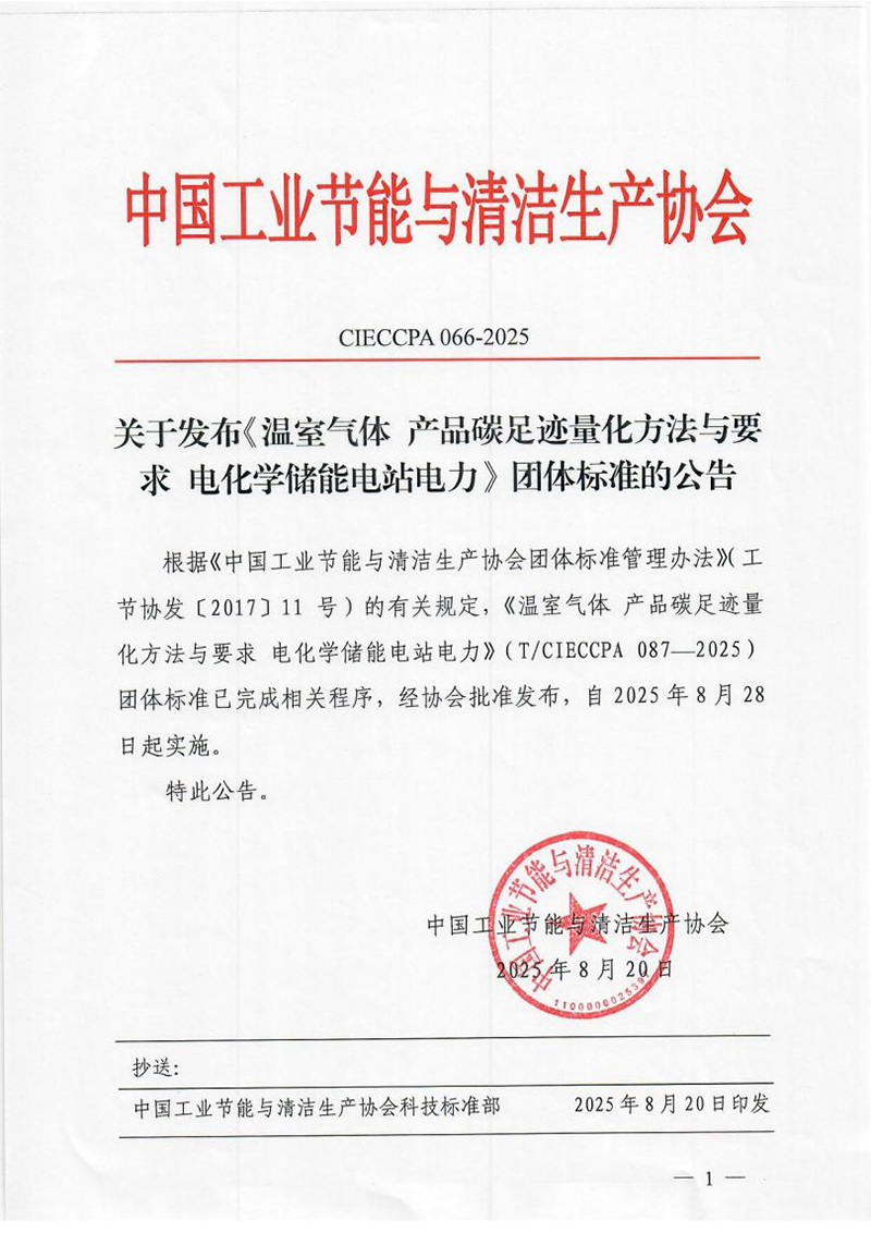 近日,由浙江省环保集团宁波环新能源有限公司牵头,联合宁波钢铁有限公司、浙江省环保集团生态环保研究院有限公司等单位共同起草的《电化学储能电站智能管理平台建设与运维技术规范》(T/CIECCPA 075-2025)与《温室气体 产品碳足迹量化方法与要求 电化学储能电站电力》(T/CIECCPA 087-2025)两项团体标准,已由中国工业节能与清洁生产协会正式发布,并分别于2025年6月9日、8月28日起实施。该两项标准的出台,有效填补了电化学储能领域在智能化管理与碳足迹量化方面的关键技术空白。